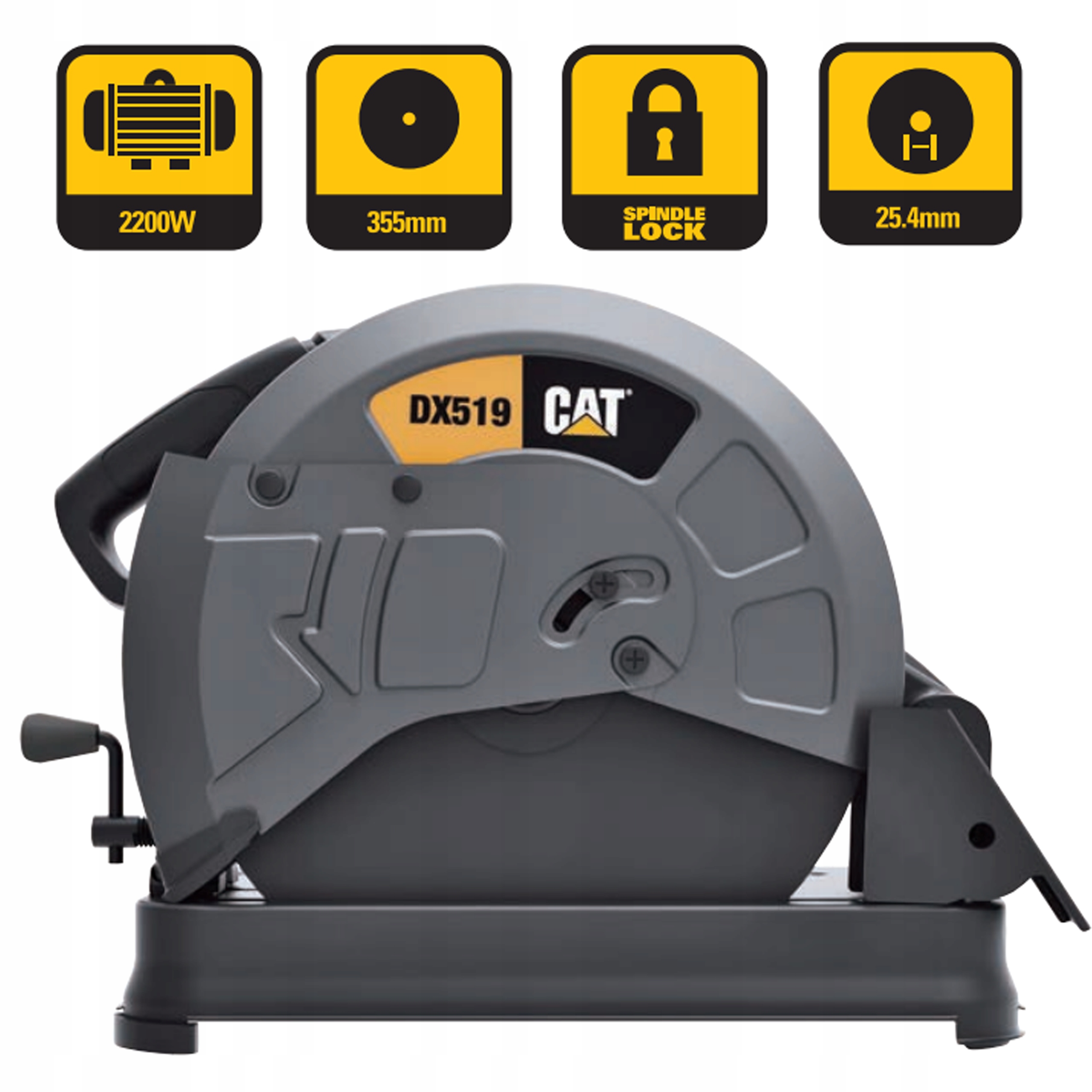 _ Sierra sensitiva Cat provista de un potente motor monofásico de 2200 W y disco de corte de 14" 355 mm , ideal para todo tipo de cortes en metales ferrosos. Equipada con una base de trabajo rígida de metal reforzado y manija ergonómica de accionamiento para un corte fácil de manipular y sumamente prolijo.