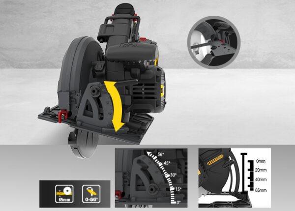 - Prof. Corte a 45°: 46 Mm, a 90°: 65 Mm
