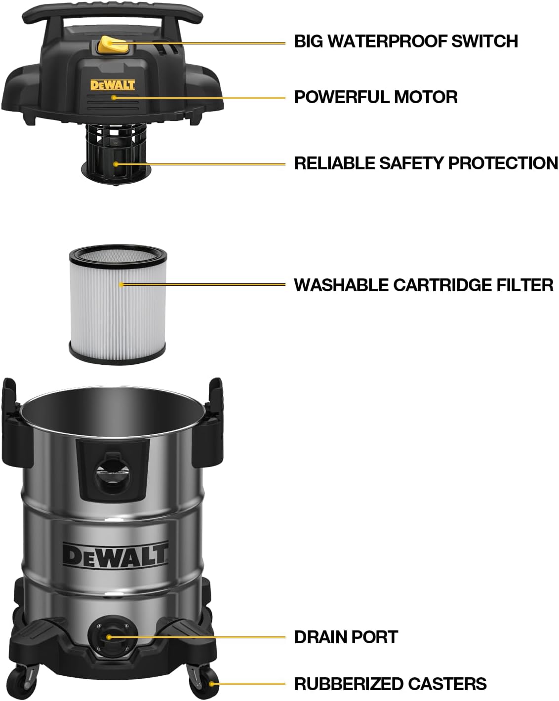 Funciones de soplado seco y húmedo: la aspiradora DEWALT tiene tres funciones: puede aspirar líquidos derramados y suciedad seca, polvo, sierras y suciedad. Con la función de soplado, puedes soplar el polvo de las hojas del patio y el césped