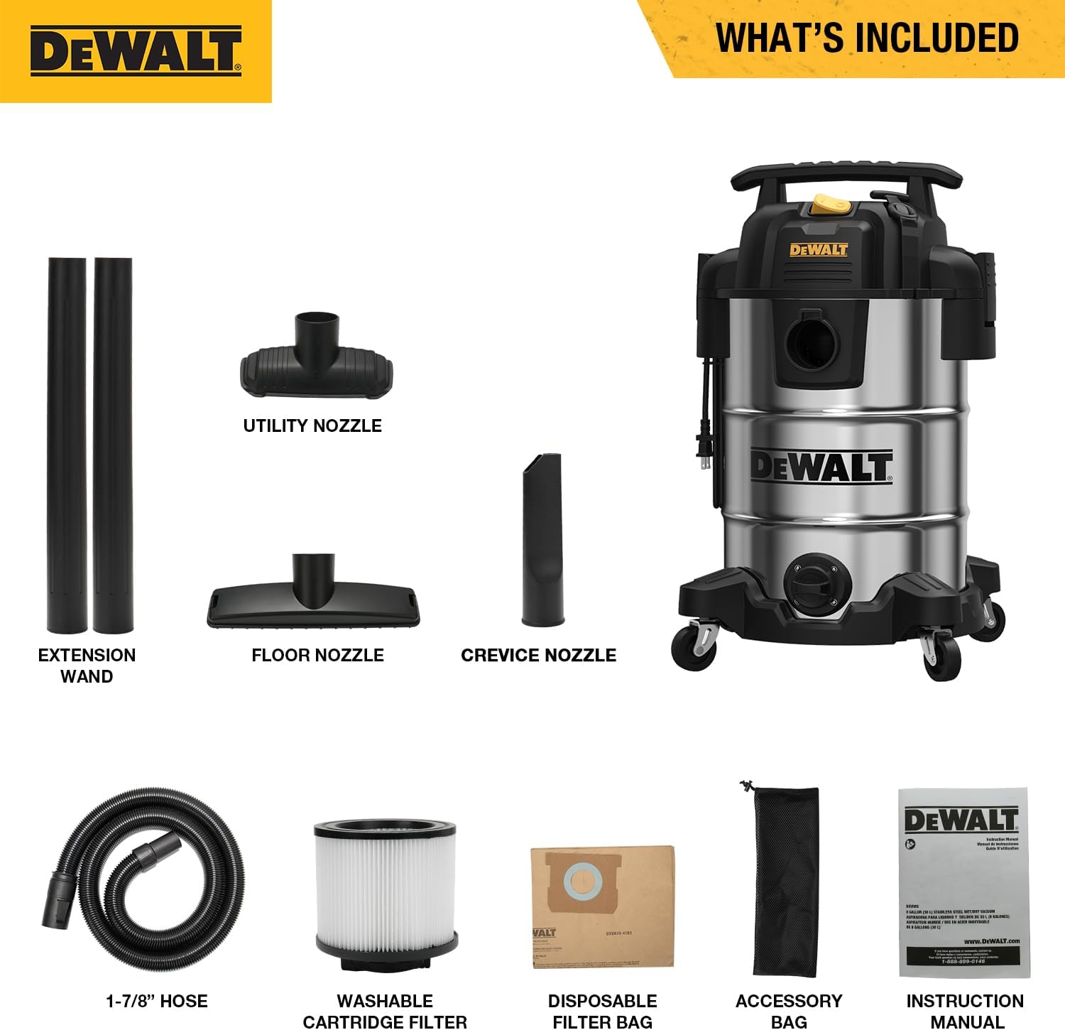 Accesorios incluidos: 1 manguera, 2 varillas de extensión, filtro de cartucho lavable y reutilizable, boquilla para suelo, boquilla multiusos, boquilla para juntas, bolsa de filtro desechable y bolsa de almacenamiento de accesorios